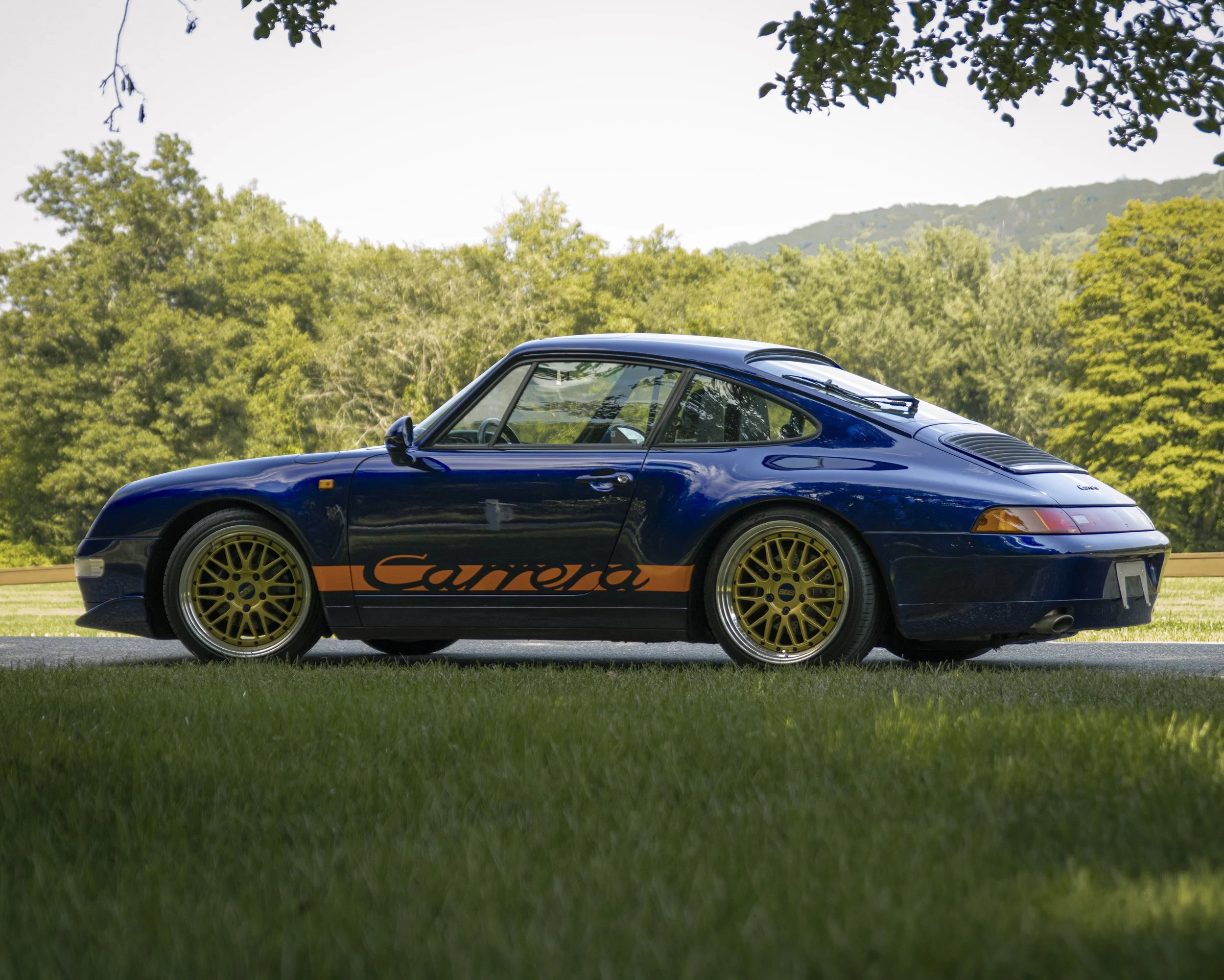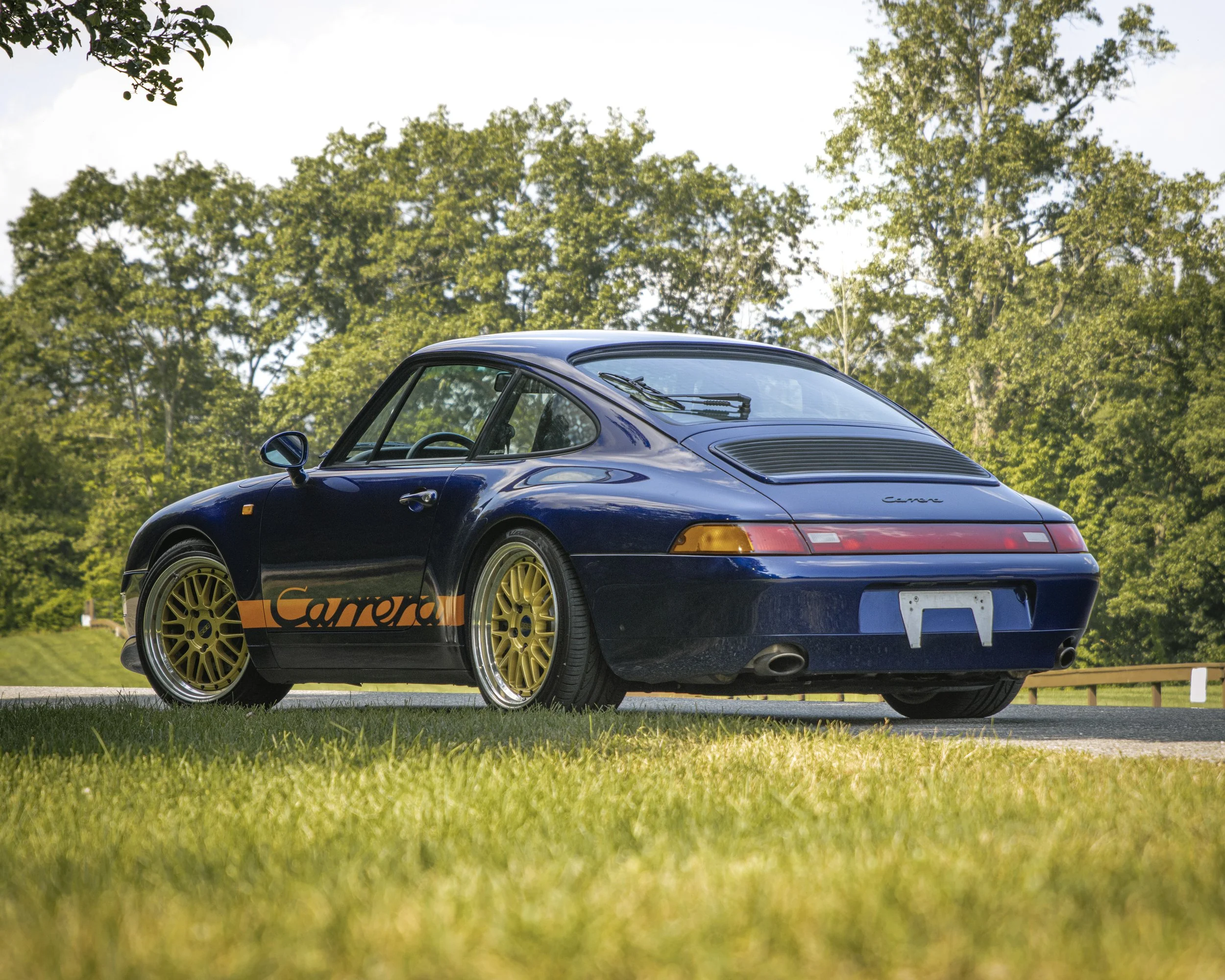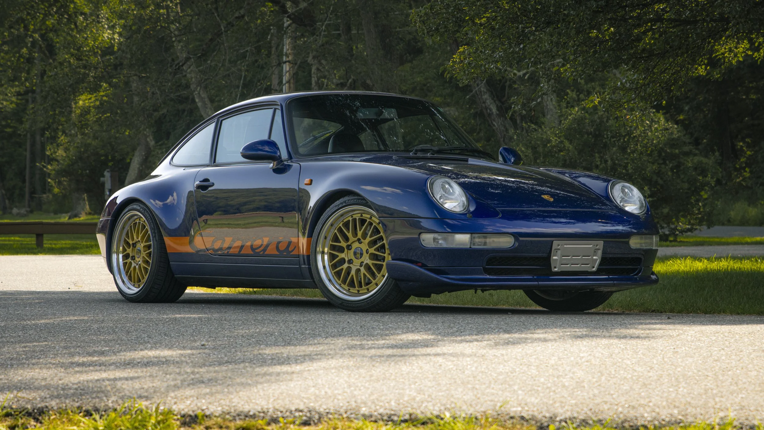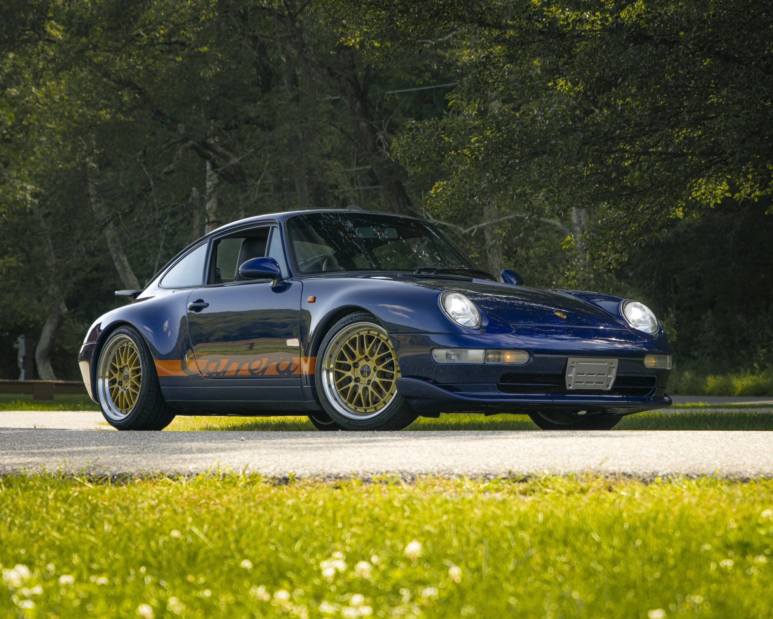 • This 1995 Porsche 911 Carrera 2 represents the final era of Porsche’s air-cooled legacy. Finished in striking Iris Blue Metallic over black leather, this 993 is both a refined driver’s car and a collectible icon. With its wide-body stance, BBS wheels, GT2 front bumper, and H&R lowering springs, it blends classic Porsche design with tasteful upgrades.